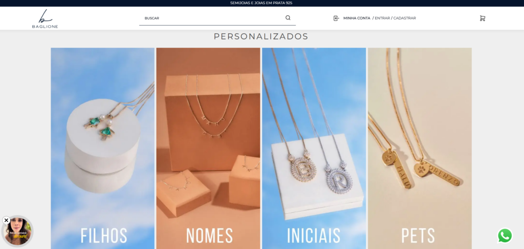 A flexibilidade da plataforma permitiu que a Baglione explorasse ao máximo o potencial dos produtos personalizados, oferecendo variações de banhos, letras e cristais de forma intuitiva para o cliente, algo que antes gerava erros operacionais.