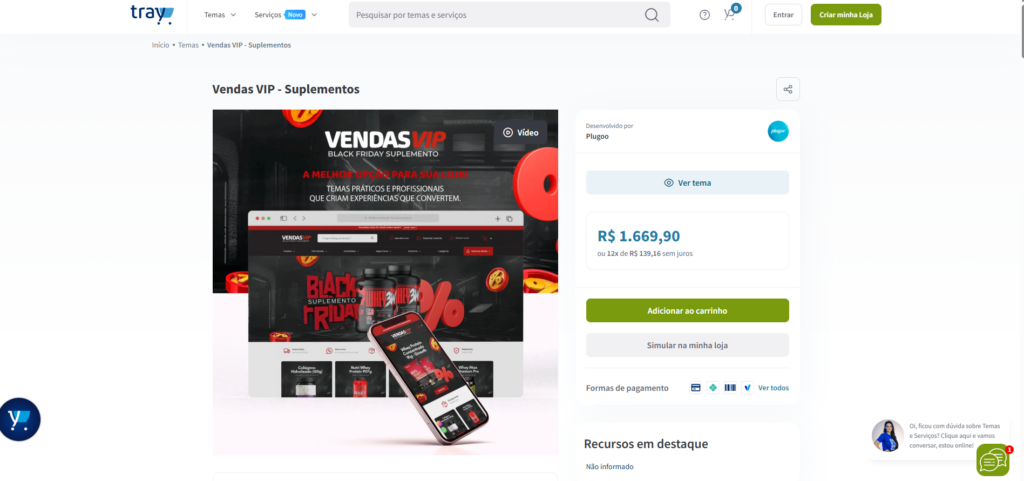 Contando ainda com alguns recursos essenciais para venda como: contador regressivo e chamadas interativas para que seu cliente consiga sanar todas as dúvidas diretamente na loja virtual.