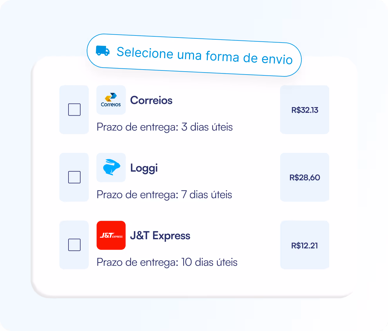 Utilize Correios, JadLog, Latam, Loggi, Buslog e J&T Express
